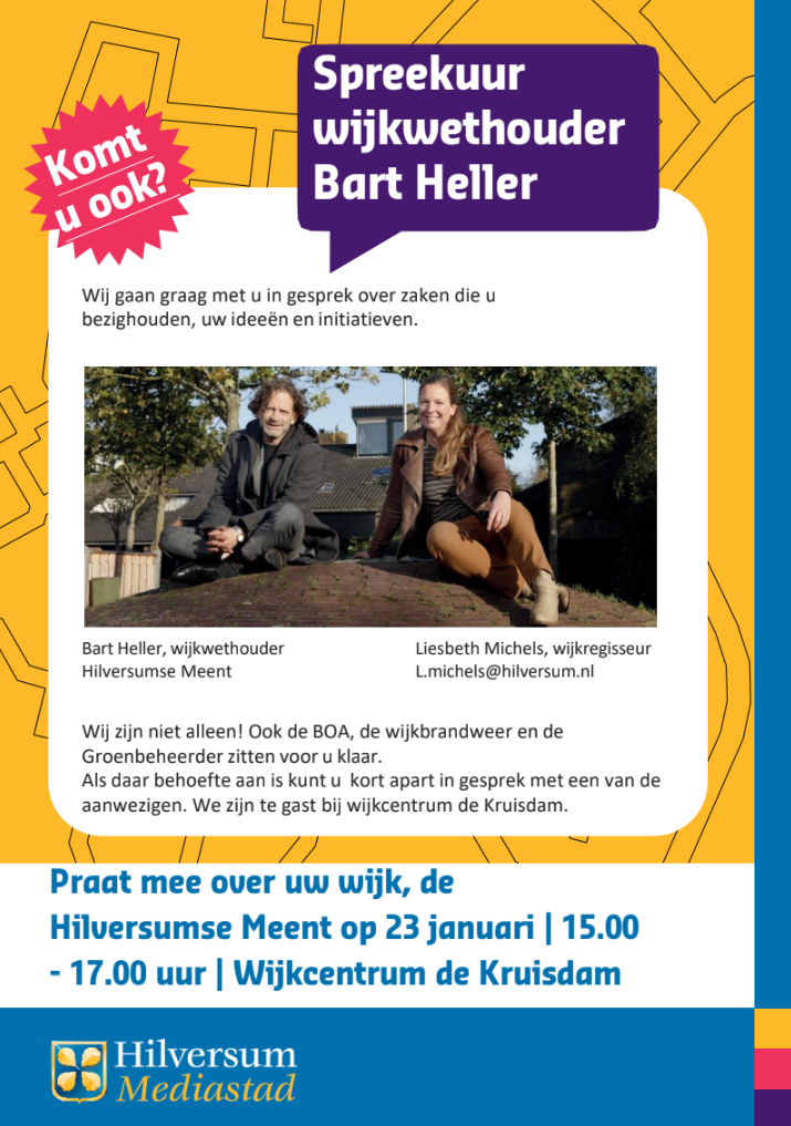 Wilt je meepraten over zaken die spelen in onze wijk? Heb je ideeën, initiatieven of vragen over de leefbaarheid en toekomst van de Hilversumse Meent? Dan nodigen wij jou van harte uit voor het spreekuur met wijkwethouder Bart Heller en wijkregisseur Liesbeth Michels.